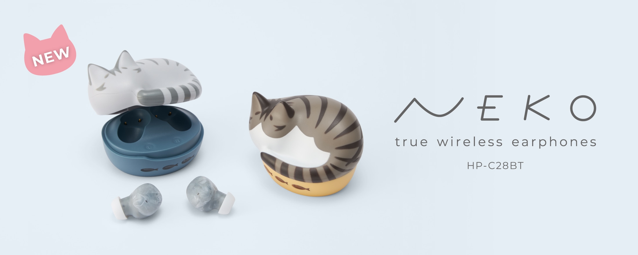 猫をモチーフにした完全ワイヤレスイヤホン「NEKO true wireless earphones HP-C28BT」の新色「サバトラ」「キジシロ」の2種を
